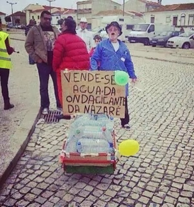 (dt.: Verkaufe Wasser der Riesenwelle aus Nazaré“)
